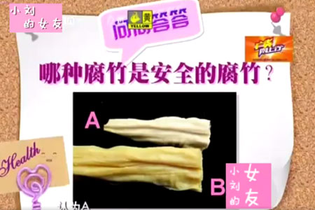 谢老师说如果是图片的这个那毫不质疑的应该是B相对更安全一点,为什么说白的那些腐竹反而不安全啦?就是优质的腐竹它自然的颜色应该是淡黄色的,它有一些光泽,如果是很白的,然后特别耀眼的那种刺眼的那种白,然后很光鲜的。这种事有可能添加了一下吊白块。