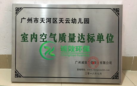 2018年7月15日,广州市天河区天云幼儿园,室内装修污染经广州诚效环保科技有限公司治理后达到国家标准,特发此铭牌。